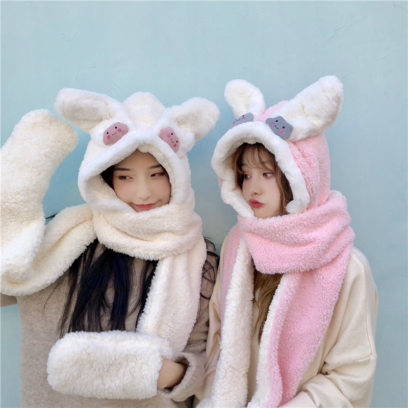 / 秋冬韓版加厚保暖護耳連帽圍脖網紅可愛毛絨絨兔耳朵帽子女士學生