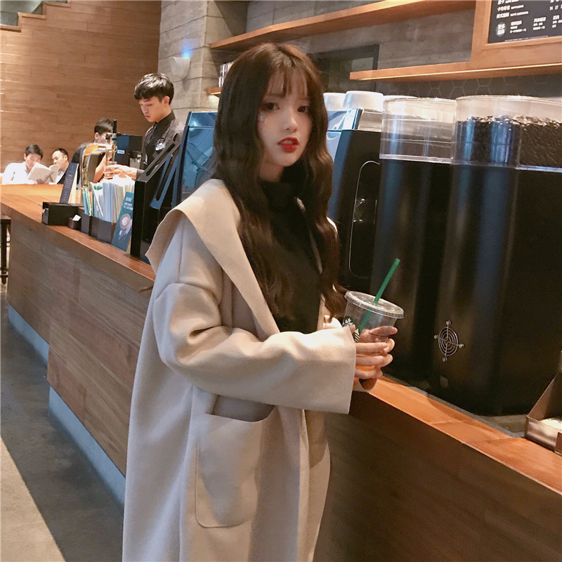 秋冬女裝韓版純色寬松呢子大衣中長款連帽赫本風過膝風衣毛呢外套