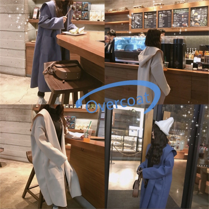 / 秋冬女裝韓版純色寬松呢子大衣中長款連帽赫本風過膝風衣毛呢外套