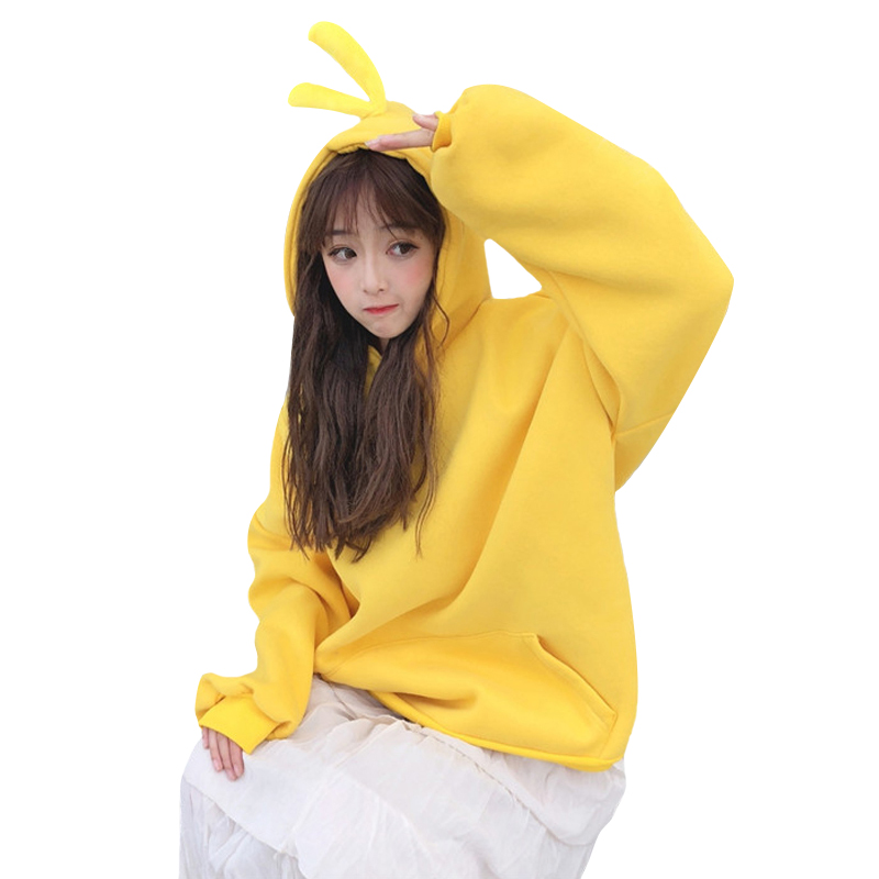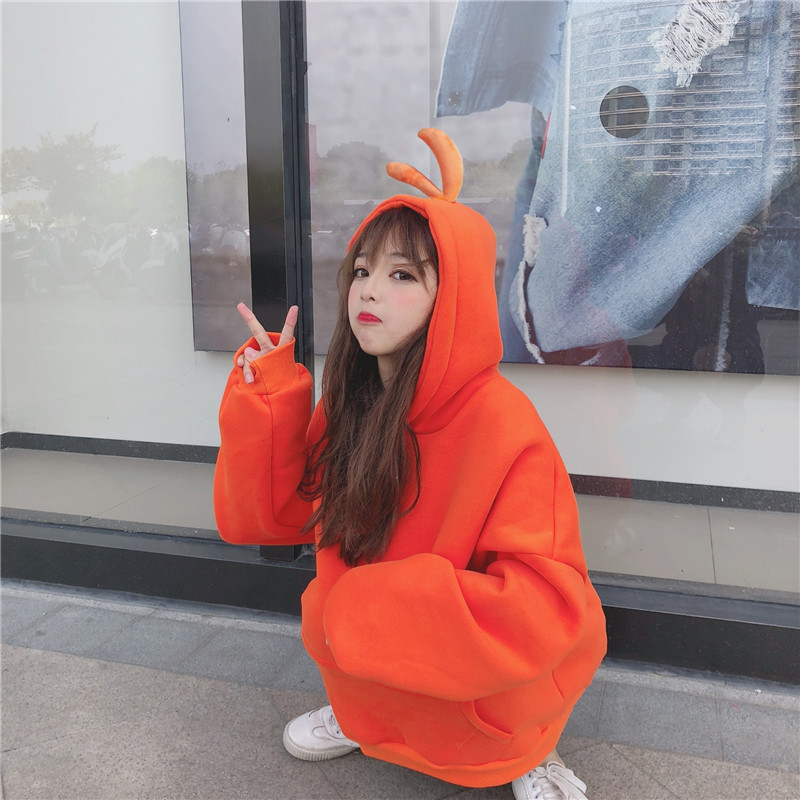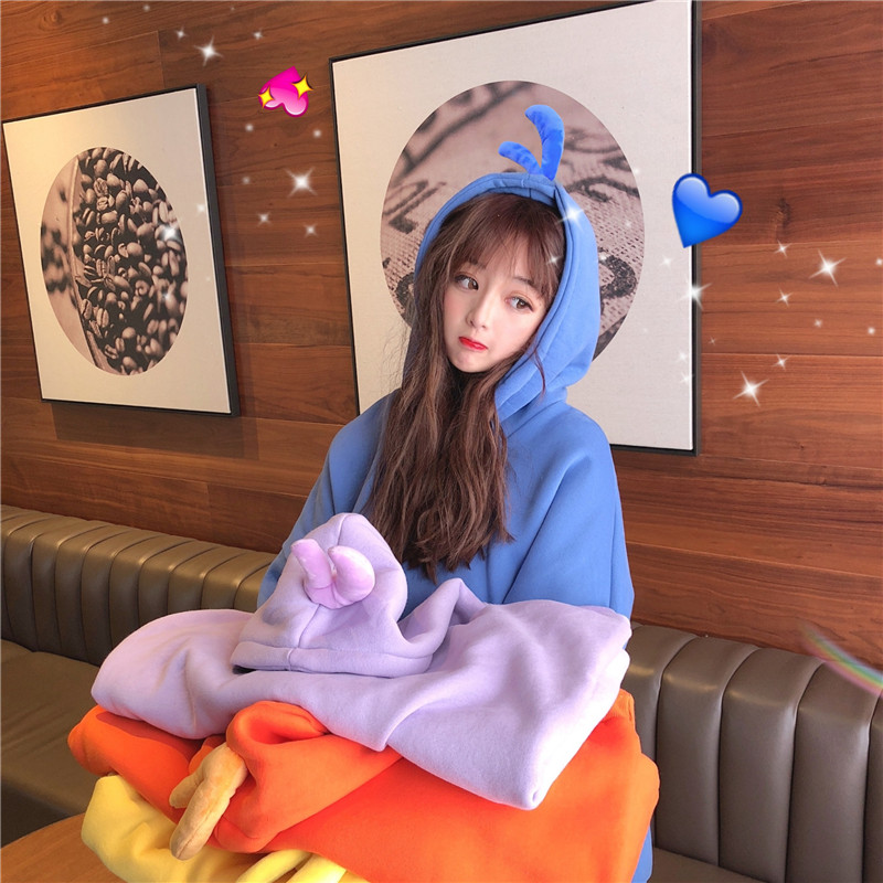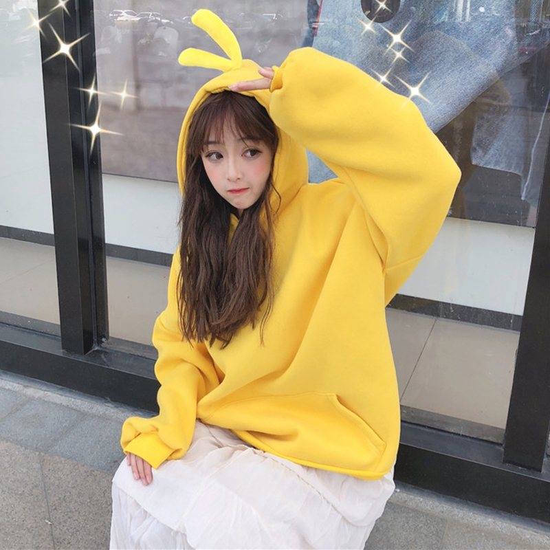 2018新款秋冬韓版寬松純色網紅小黃鴨連帽加絨加厚衛衣上衣外套女
