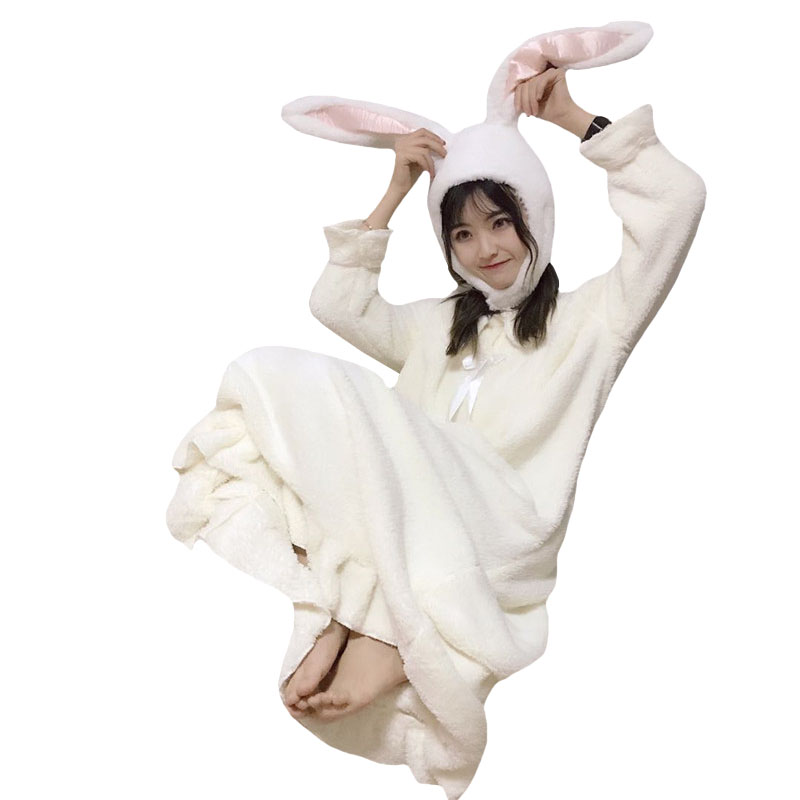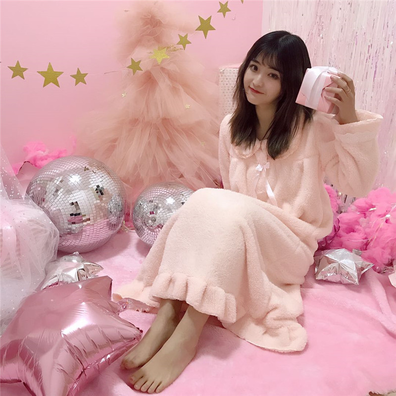 / 秋冬韓版可愛甜美毛絨絨加厚長袖睡衣連衣裙學生寬松中長款睡裙女