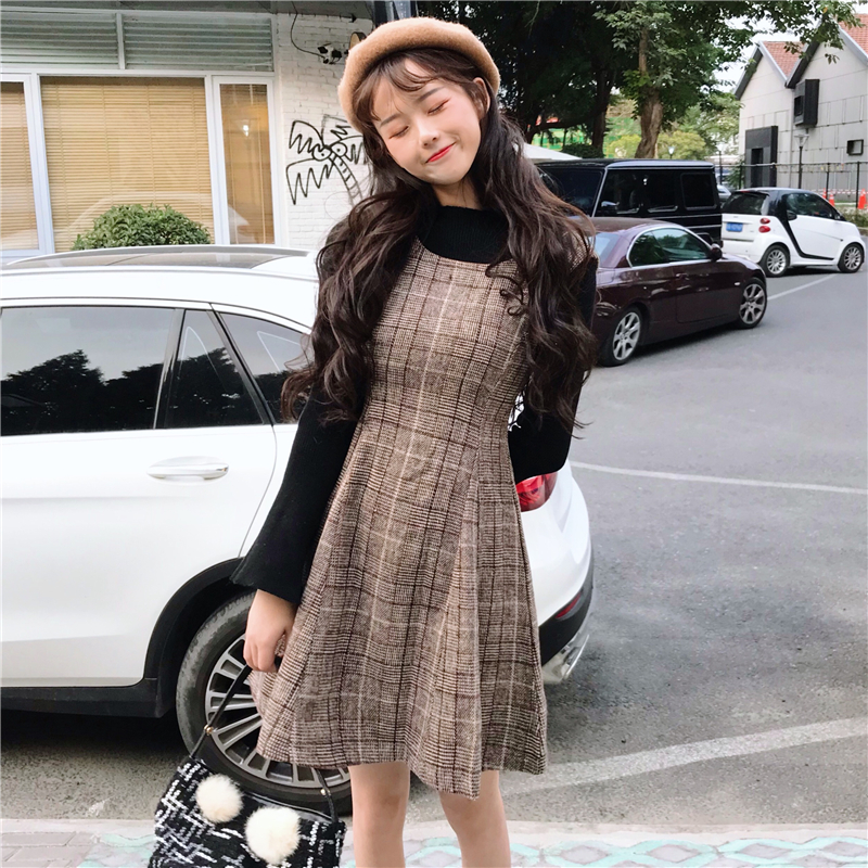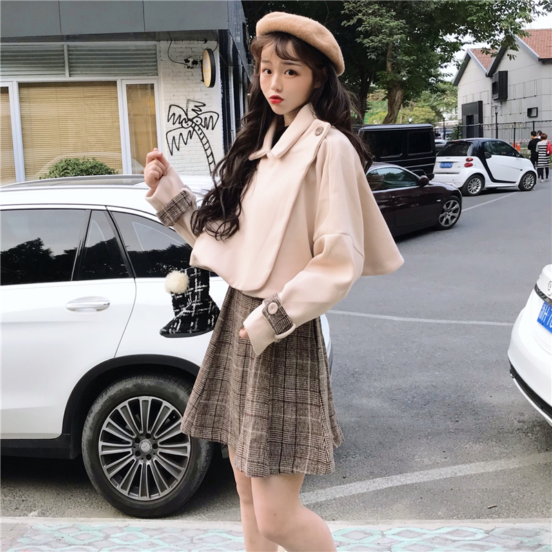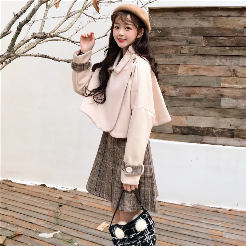 / 韓版時尚休閑套裝秋季短款加厚斗篷毛呢外套+格子吊帶裙兩件套女
