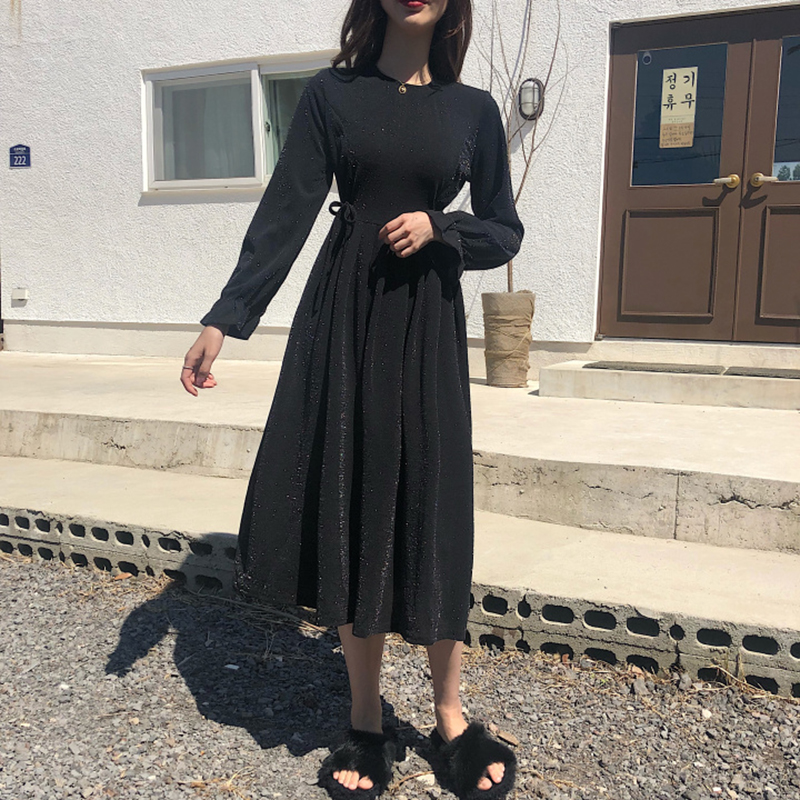 / 高領范成熟女裝連衣裙秋裝2018新款氣質閃閃亮絲收腰a字大擺裙子