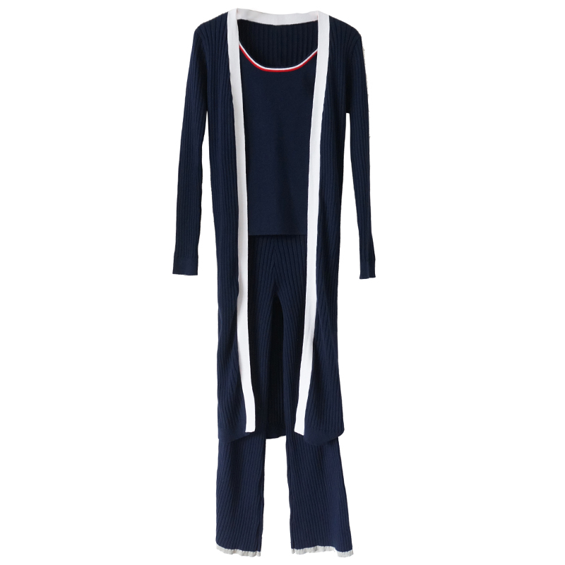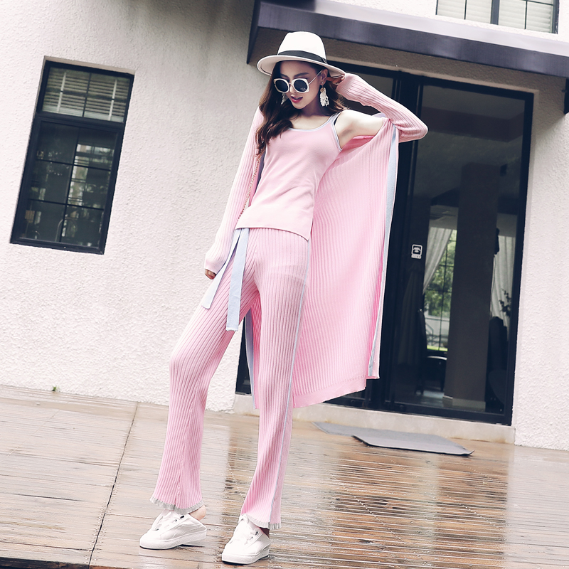 / 歐洲站港味網紅休閑套裝女秋季2018新款吊帶喇叭闊腿褲針織三件套