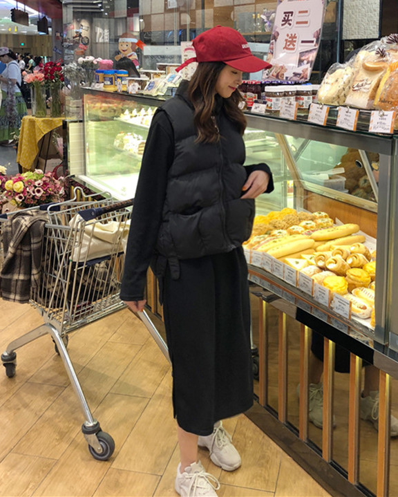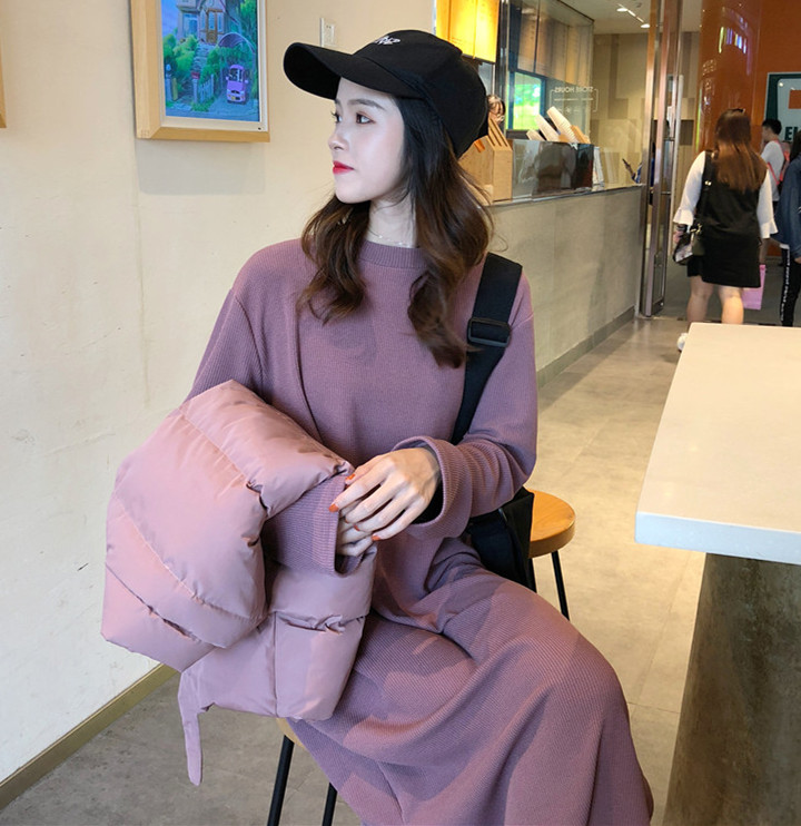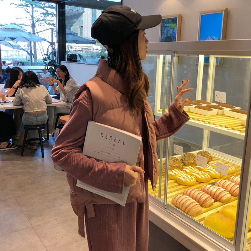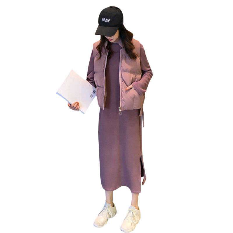 / 韓版時尚休閑套裝秋冬女裝面包服棉衣馬甲外套+打底連衣裙兩件套