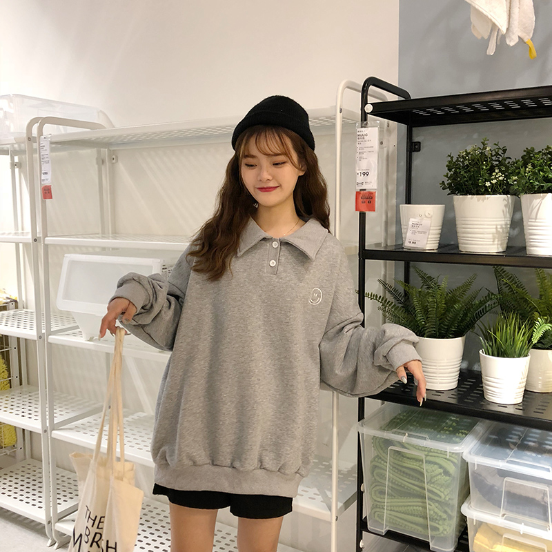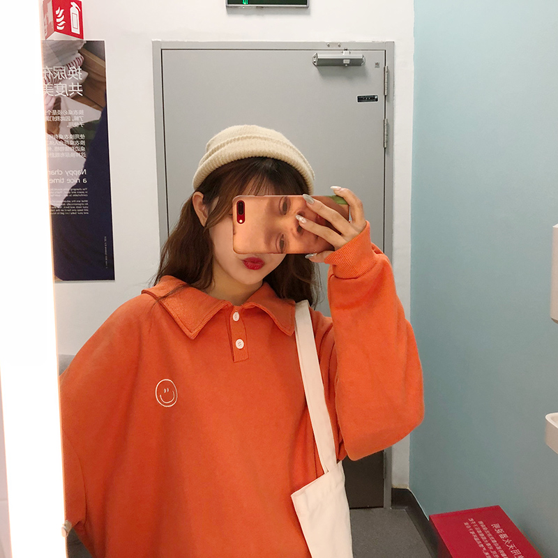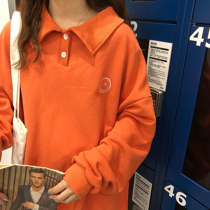 / 2018新款秋冬韓版寬松卡通笑臉加絨加厚polo領套頭衛衣上衣外套女