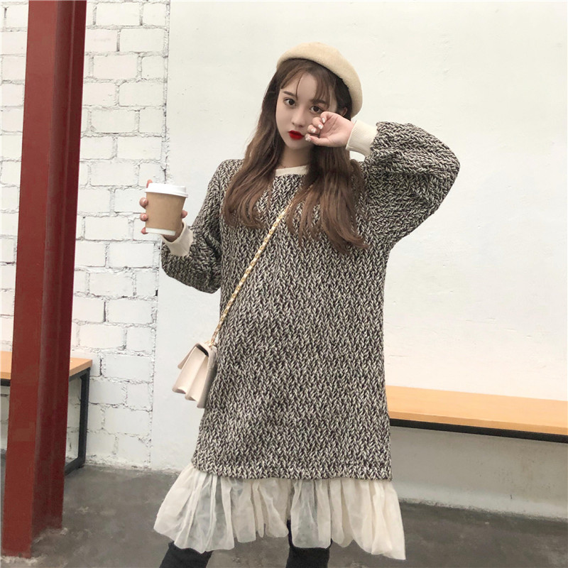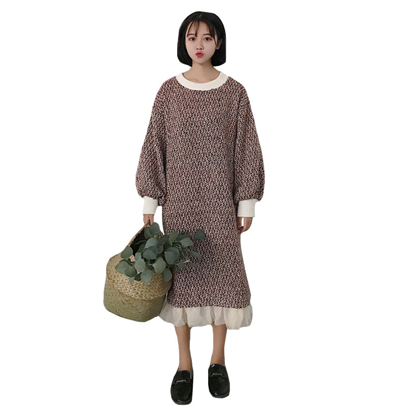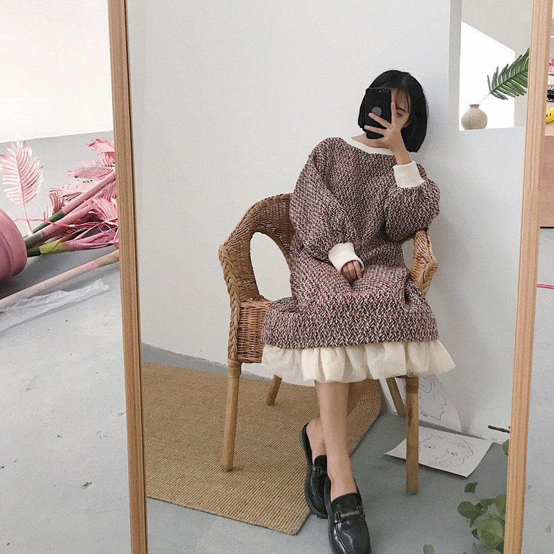 / 2018新款秋冬韓版中長款復古氣質網紗拼接粗花呢長袖連衣裙長裙女