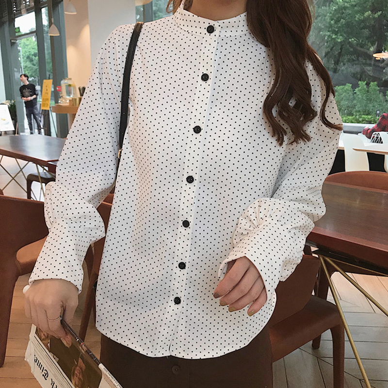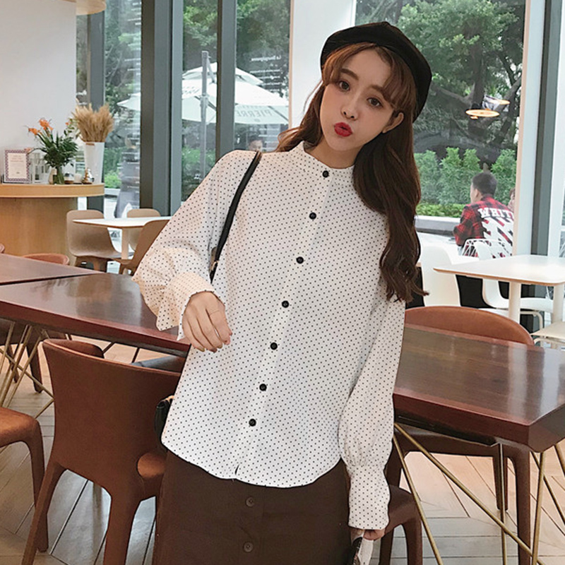 襯衫女秋冬裝2018新款韓版波點燈籠長袖上衣學生顯瘦中長打底開衫