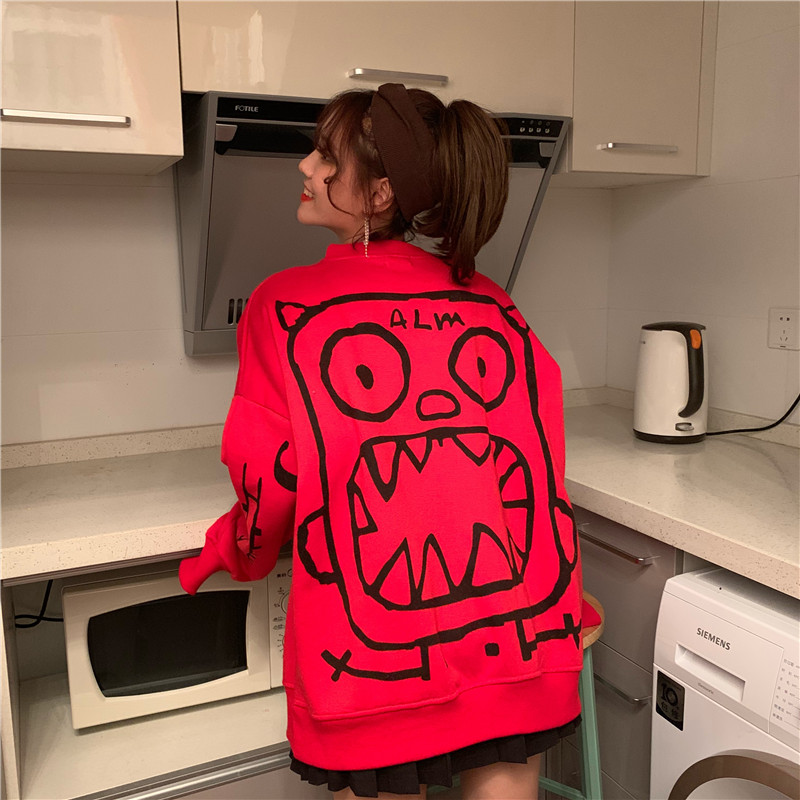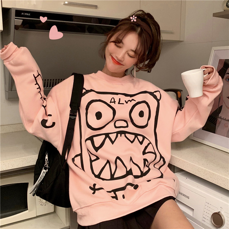 / 秋冬女裝韓版中長款慵懶風寬松涂鴉卡通加絨加厚套頭衛衣上衣外套