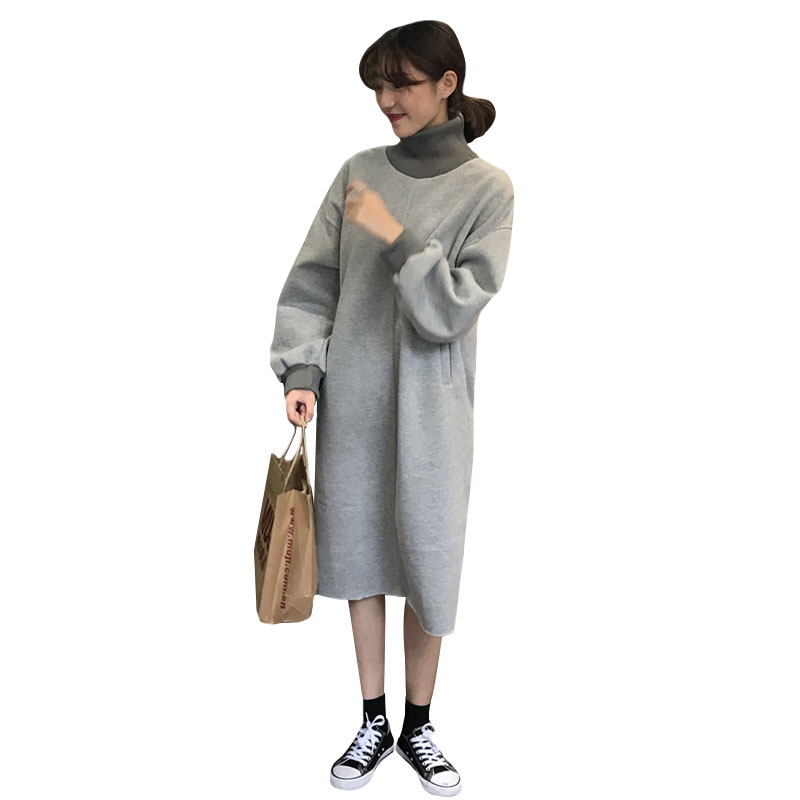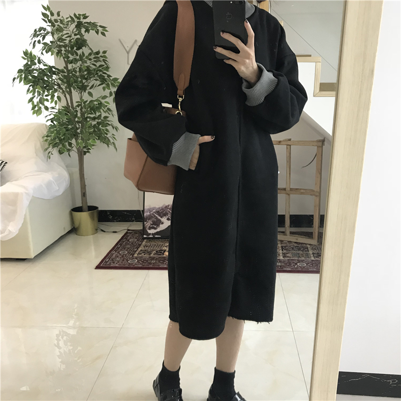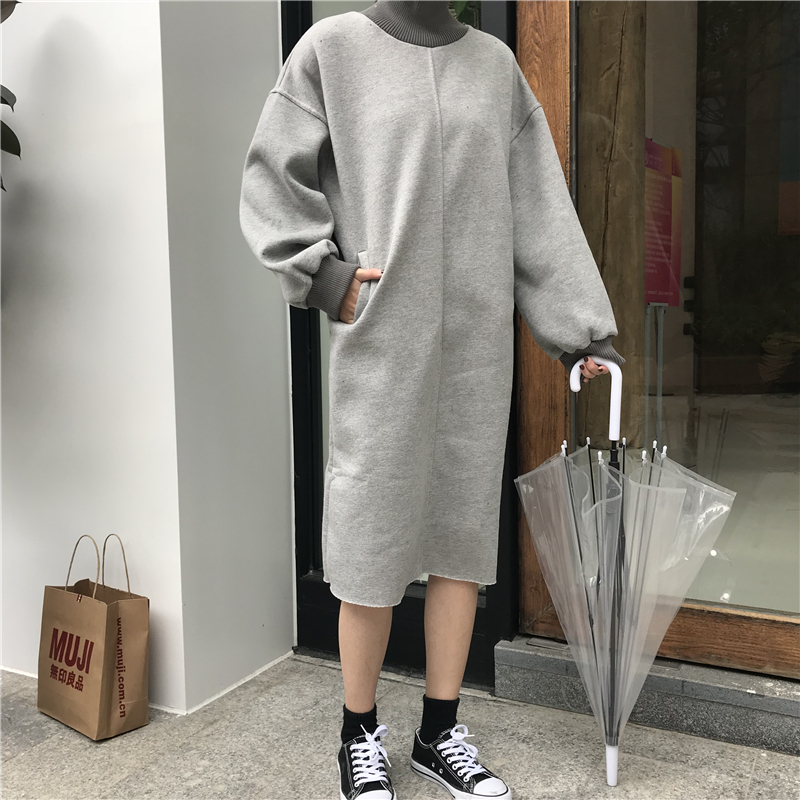 / 秋冬韓版中長款慵懶風寬松拼接高領加絨加厚套頭超火衛衣裙外套女