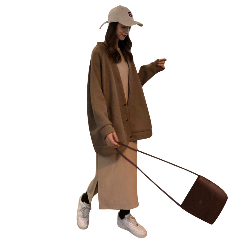 / 韓版時尚休閑套裝秋季女裝中長款毛呢外套+加厚長款連衣裙兩件套
