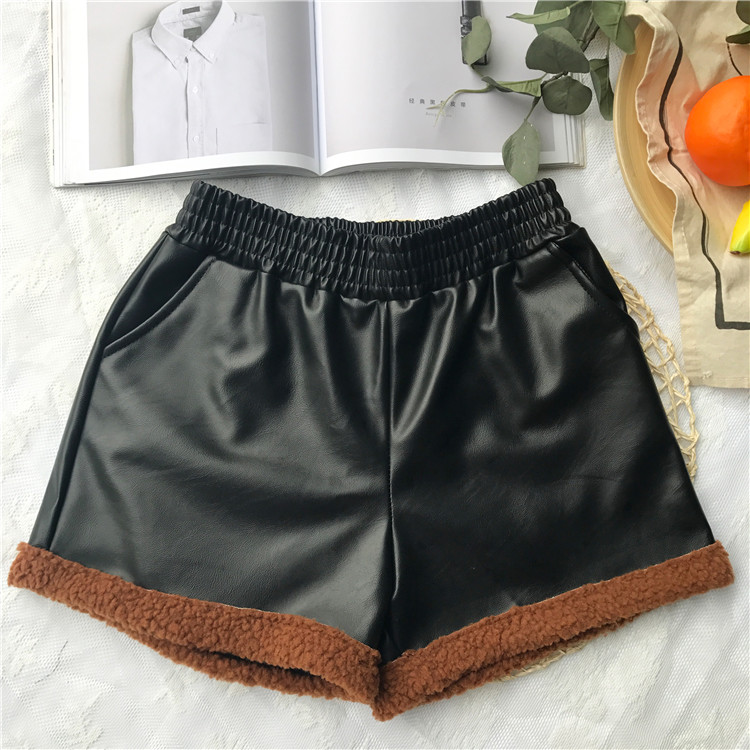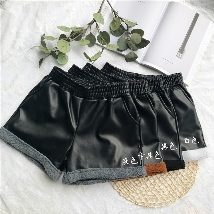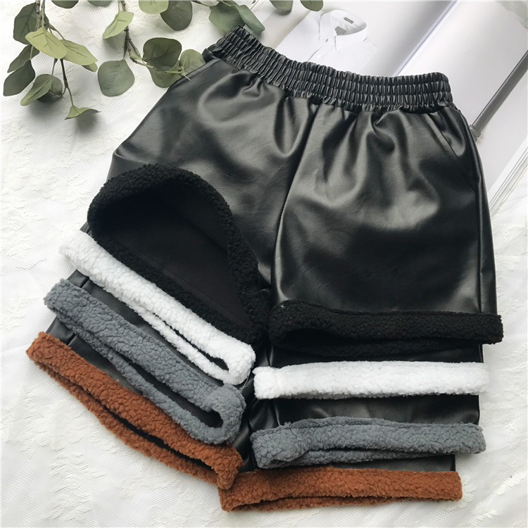 / 秋冬韓版PU皮褲子松緊腰燈芯絨拼接闊腿褲加絨休閑褲直筒褲短褲女