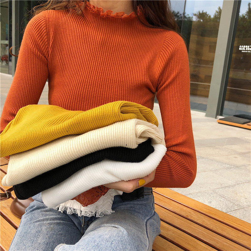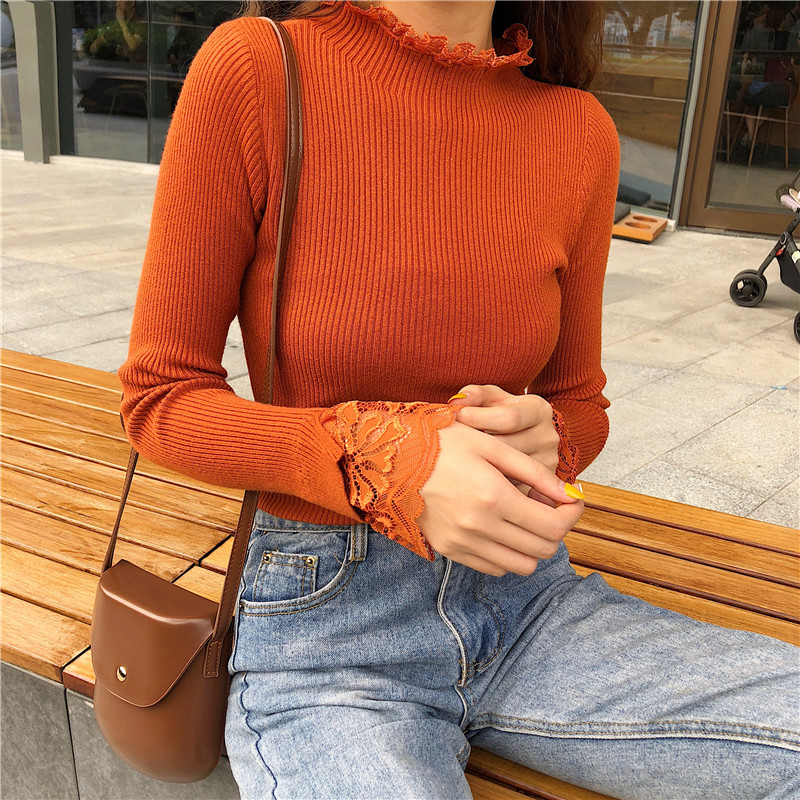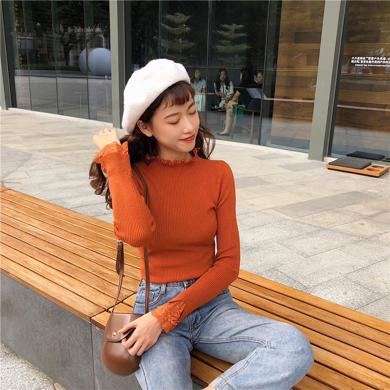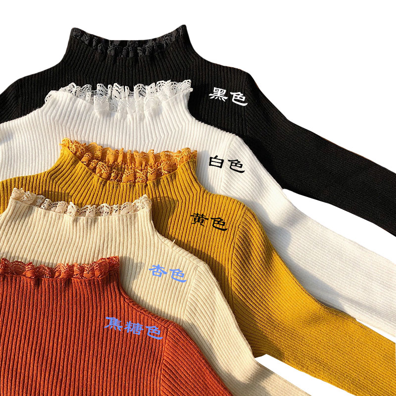/ 秋冬女裝韓版修身純色蕾絲花邊打底衫網紅套頭針織衫超火毛衣上衣