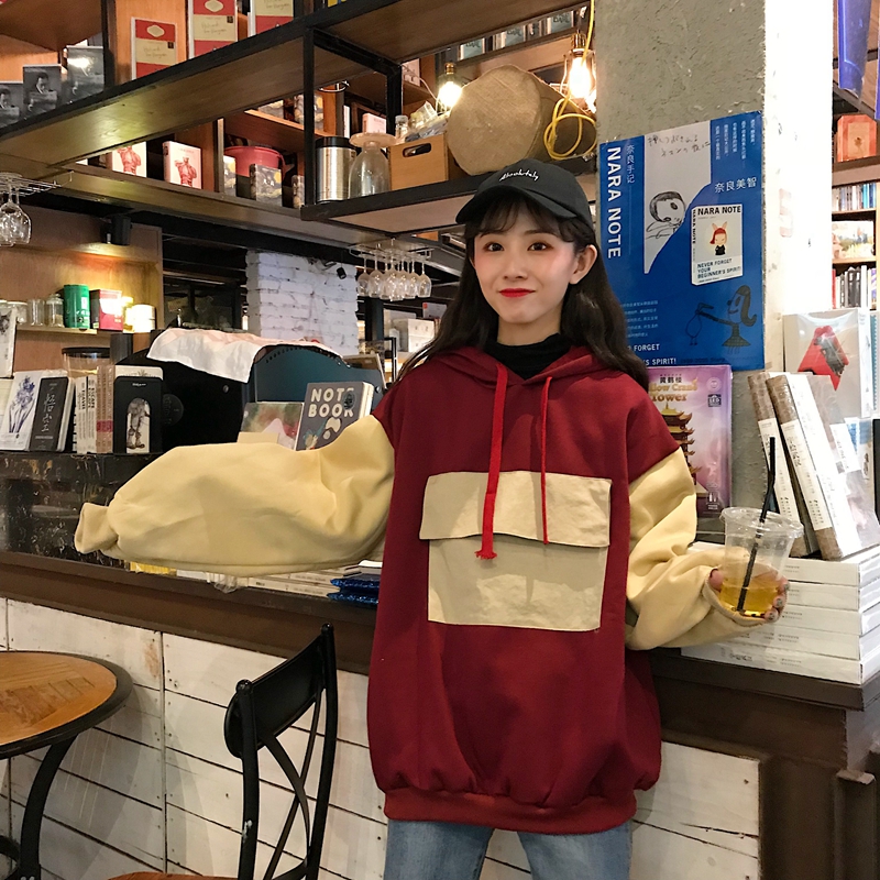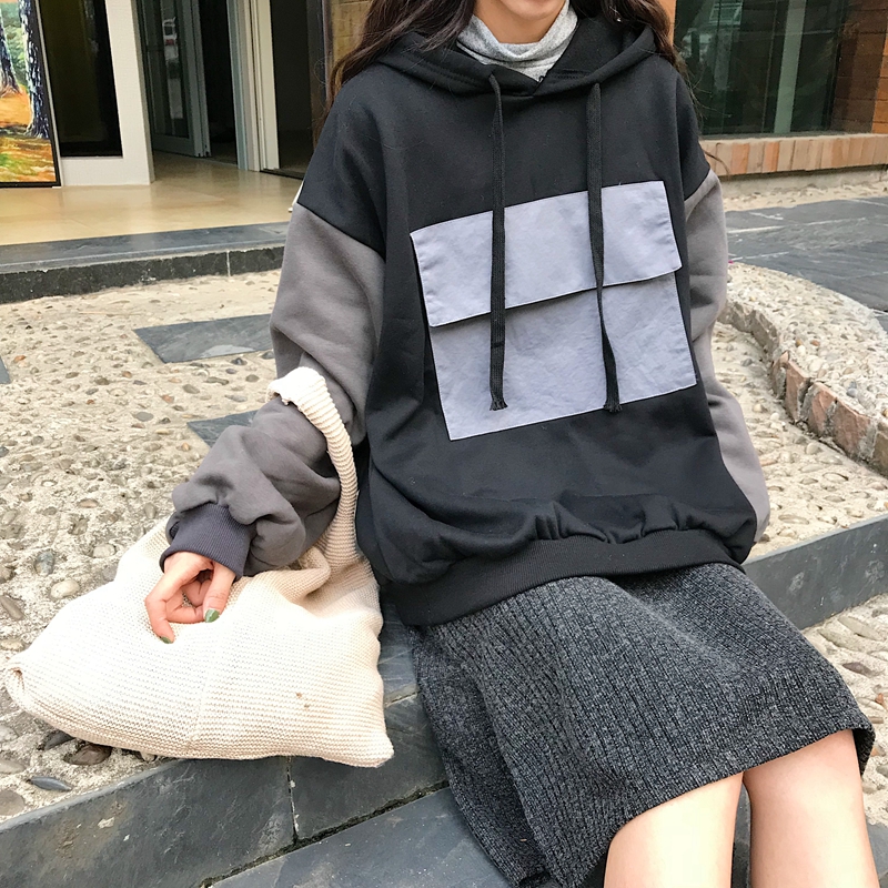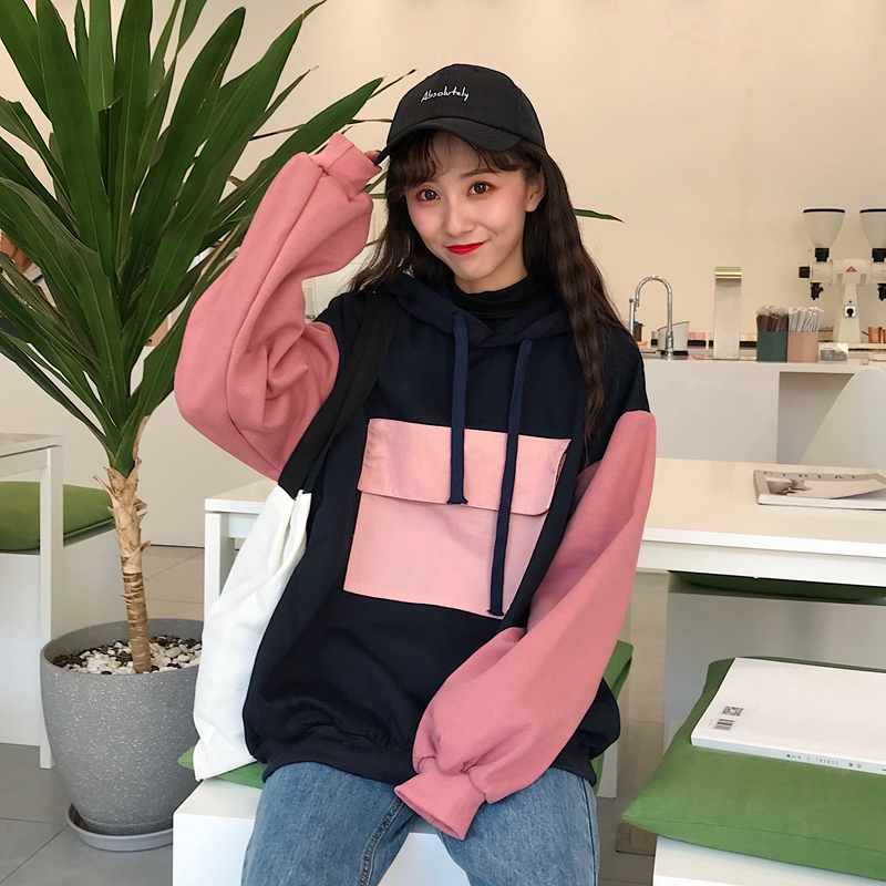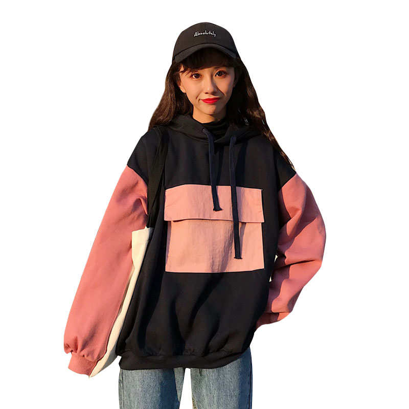 2018新款秋季女裝韓版復古拼色寬松口袋連帽套頭超火衛衣上衣外套
