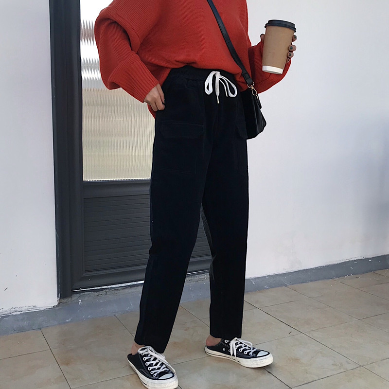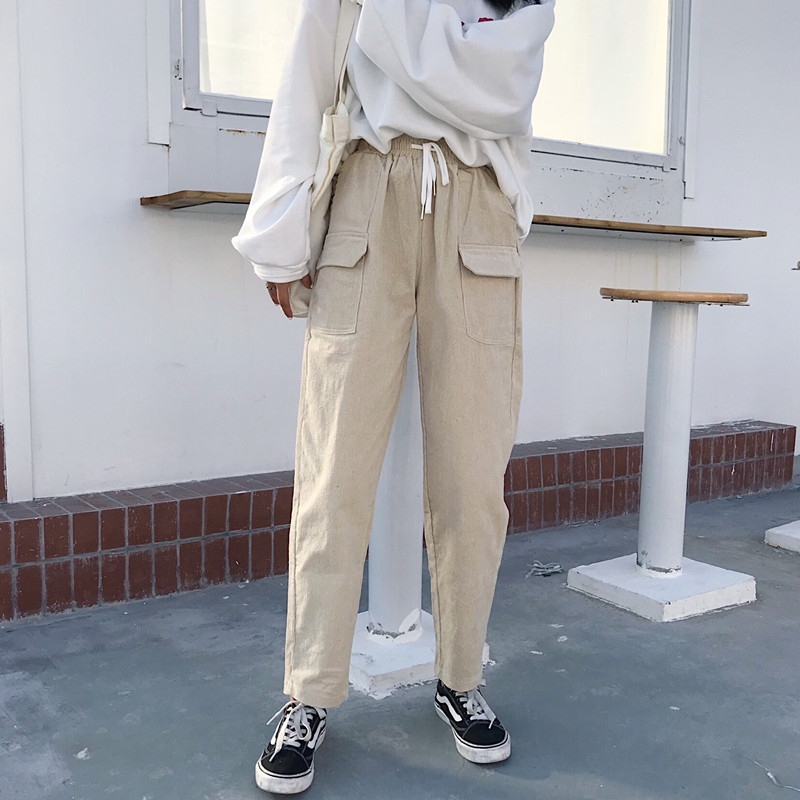 / 秋冬韓版寬松燈芯絨松緊腰哈倫褲直筒褲高腰闊腿褲長褲學生褲子女